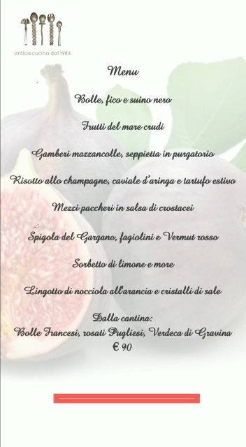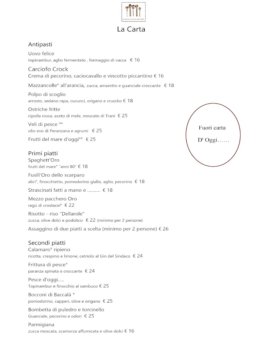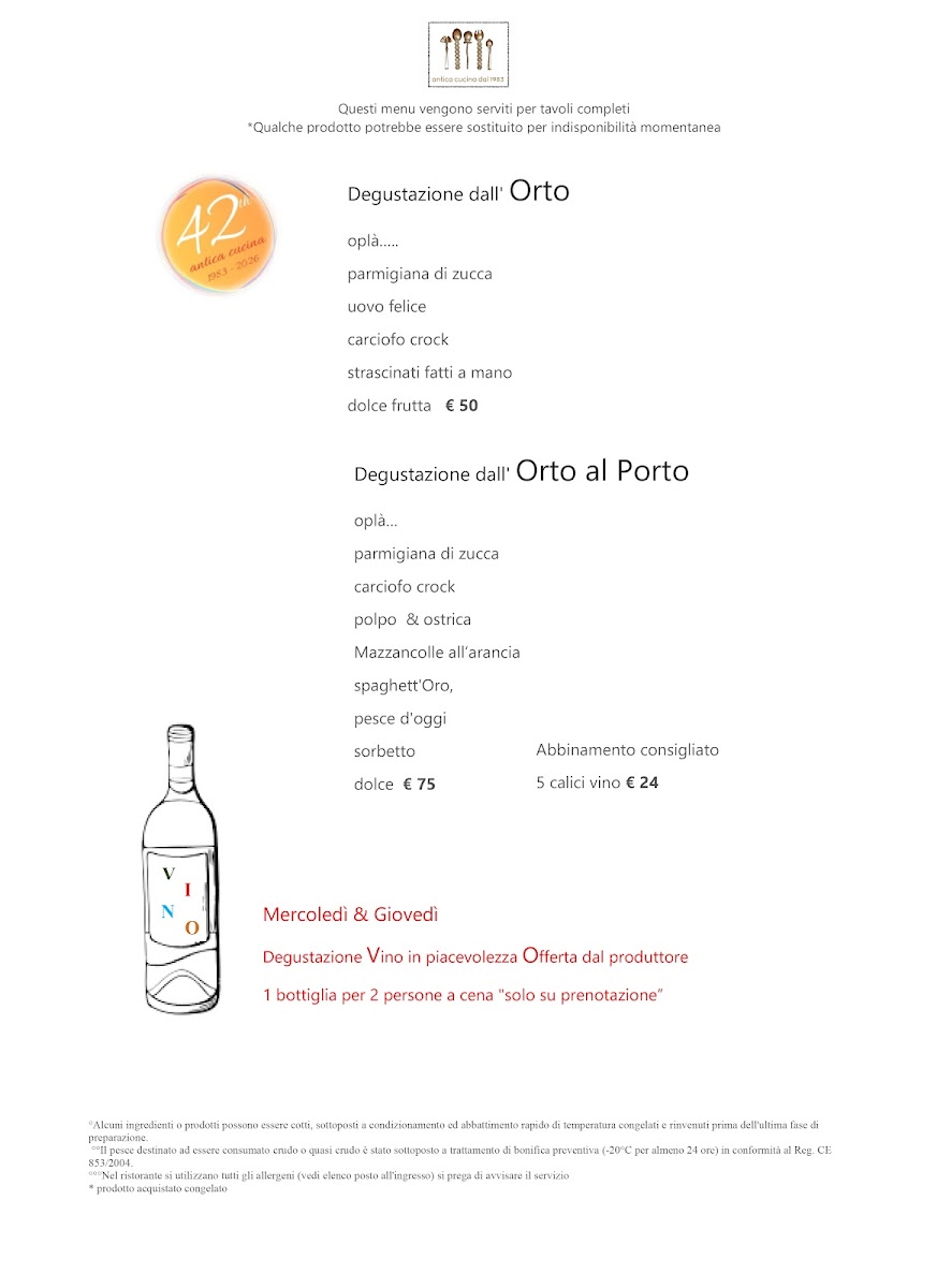 From a reviewer’s perspective, the menu at Antica Cucina 1983 offers a concise yet refined selection that reflects a traditional Italian dining experience. Guests can choose between the Menu Degustazione and the Menù alla carta, allowing either a curated tasting journey or the flexibility to select individual dishes according to personal preference. To conclude the meal, the dessert selection I Nostri Dolci provides a sweet finish, highlighting the restaurant’s attention to classic Italian pastry and dessert traditions. Overall, the menu is focused and elegant, emphasizing quality and authenticity rather than an overwhelming number of options, which contributes to a more thoughtful and enjoyable dining experience.